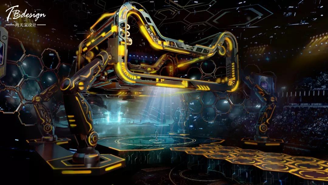 打造一个电子世界,要有统一的舞美语言,此次创造了一个以六边体为统一元素的多元组合方式。六边体设计灵感来源于生物学,赋予舞台双层含义:其一是电子世界需要强大的基因得以长久的运转,六边体正是选用基因化学元素表。其二是自然界鬼斧神工的完美设计---蜂巢,蜂巢里的规则和秩序能够让蜜蜂家族自人类起始延续至今,这也是尚天宝对这一电子世界最美好的愿景。